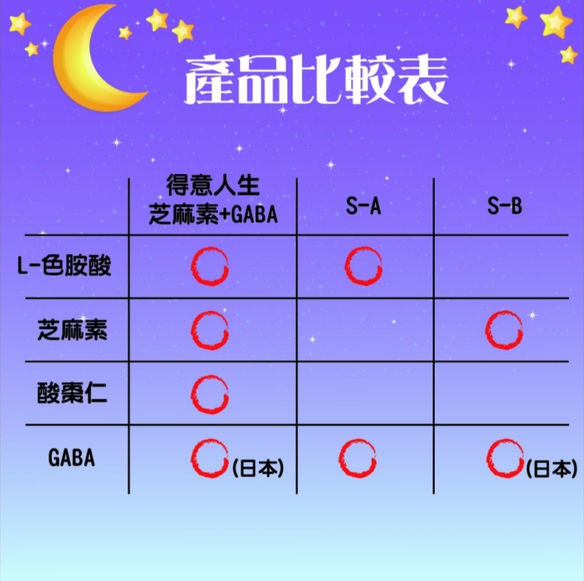 主要成份:L-色胺酸、酸棗仁萃取、胚芽米萃取(r-GABA)、芝麻素、維生素B1、維生素B2、維生素B6、維生素B12、菸鹼酸、葉酸、生物素、泛酸