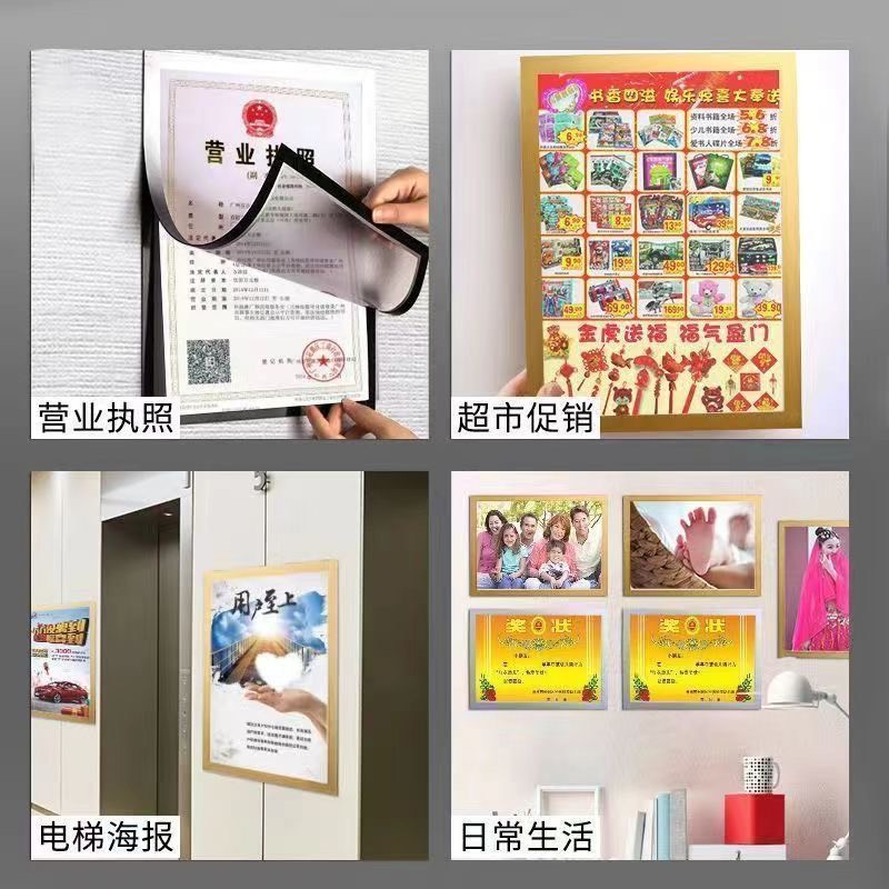 一款不用打洞、不用黏膠,也不會破壞牆面的磁性透明展示框,專門用來放營業執照、菜單公告、海報、獎狀、宣傳單等。輕鬆吸附貼牆、玻璃、冰箱或門面,貼上就能展示,取下換紙也超方便!